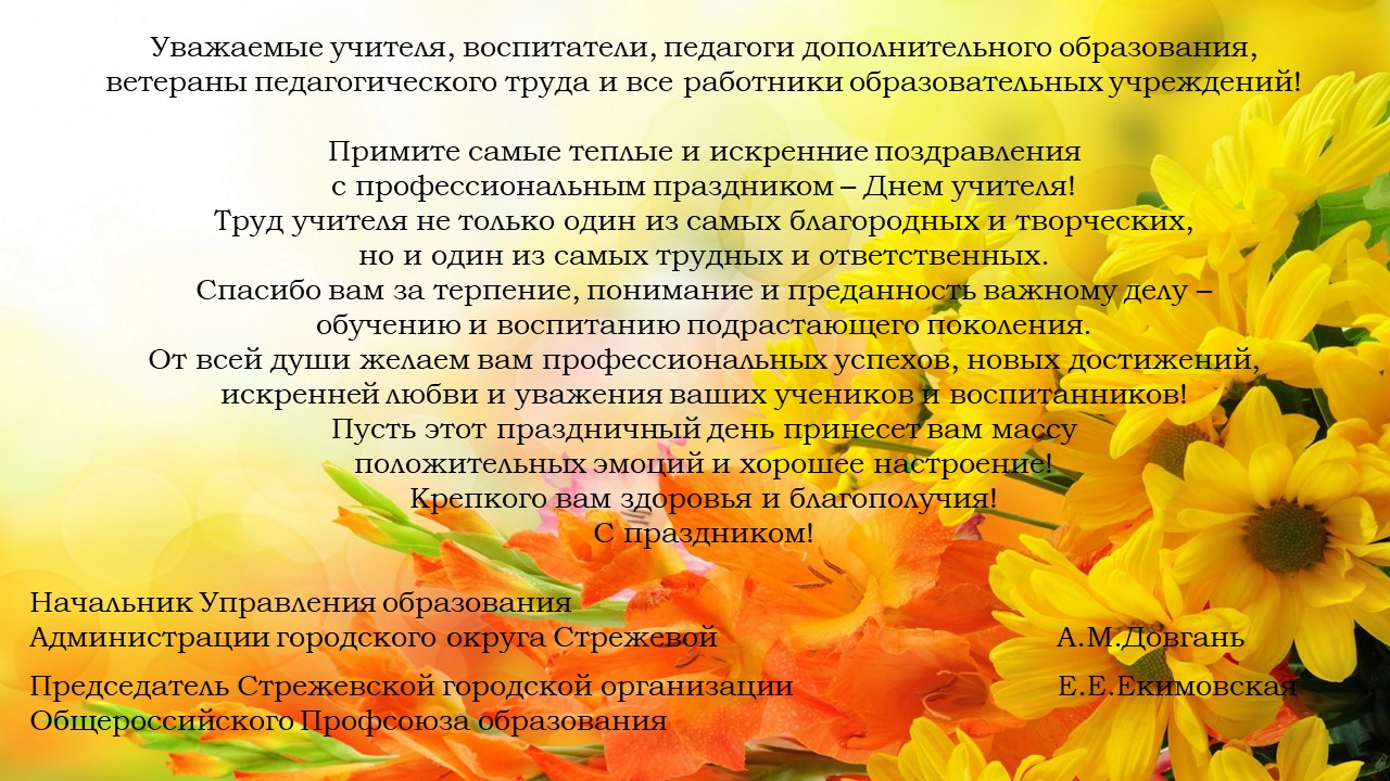 В программе мероприятия планируется участие депутата Законодательной Думы Томской области В.М.Харахорина, председателя Думы городского округа Стрежевой Н.А.Гришко, заместителя Мэра по социальной политике В.В.Салмина, выступление с информацией об итогах года и предстоящих задачах на новый учебный год начальника Управления образования А.М. Довгань, выступление творческих коллективов, вручение заслуженных наград, представление вновь прибывших и молодых педагогов, чествование ветеранов педагогического труда.